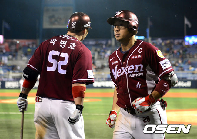 5회초 무사에서 넥센 이택근이 솔로포를 날리고 더그아웃으로 향하고 있다.