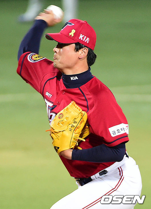 7회말 삼성 공격 1사 1, 3루 상황 KIA 투수 최영필이 힘차게 공을 뿌리고 있다.