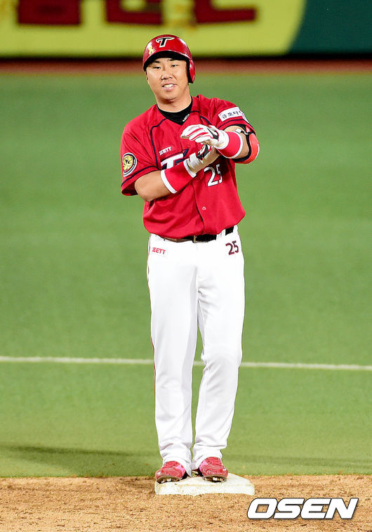 8회초 KIA 공격 2사 1루 상황 이범호가 좌익선상 2루타를 날리고 2루에 안착해 미소짓고 있다.
