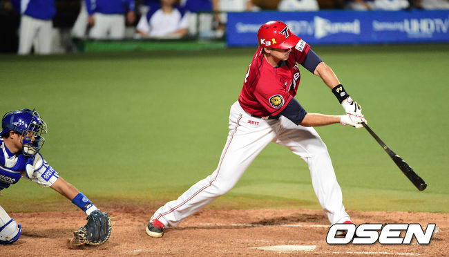 8회초 KIA 공격 2사 2, 3루 상황 대타 필이 삼성 투수 안지만에게 헛스윙 삼진을 당하고 있다.