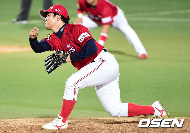 8회말 삼성 공격 때 마운드에 오른 KIA 김병현이 힘차게 공을 뿌리고 있다.