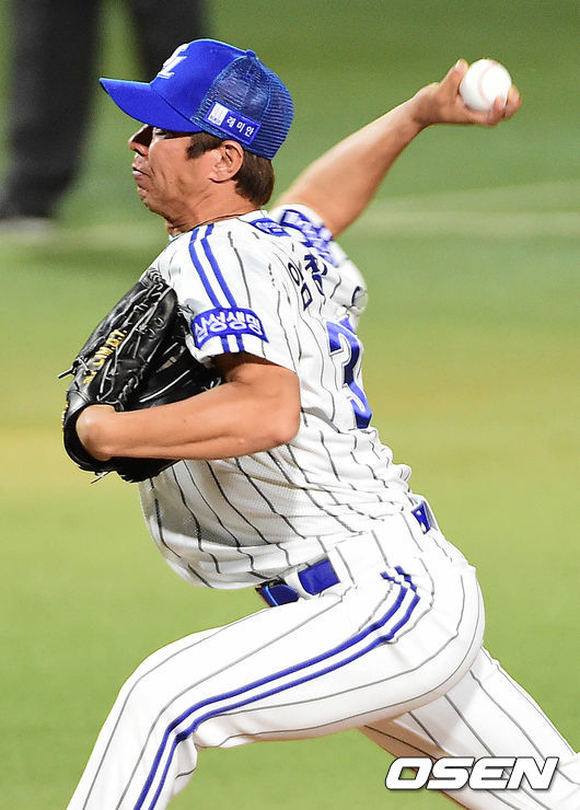 9회초 KIA 공격 때 마운드에 오른 삼성 투수 임창용이 힘차게 공을 뿌리고 있다.