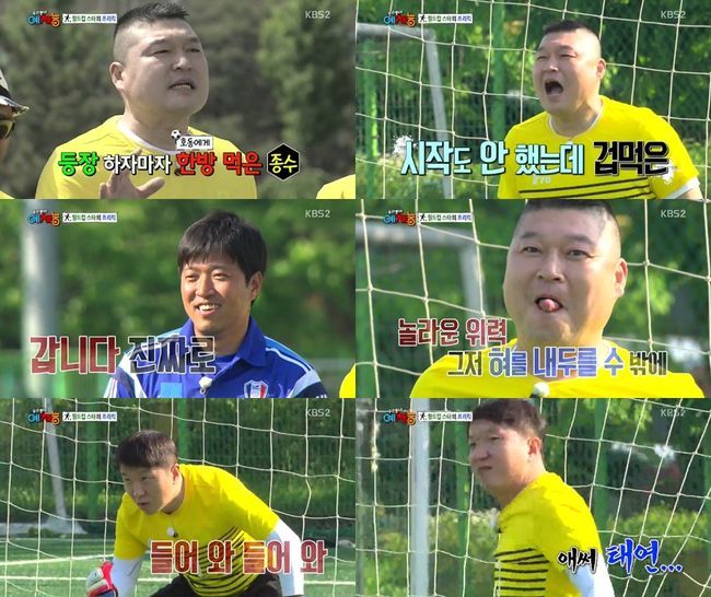 이날 가장 먼저 강호동이 골키퍼로 나서며 고종수의 공을 막아보려 했다. 하지만 강력한 고종수의 공에 강호동은 움찔하며 피해 웃음을 자아냈다.