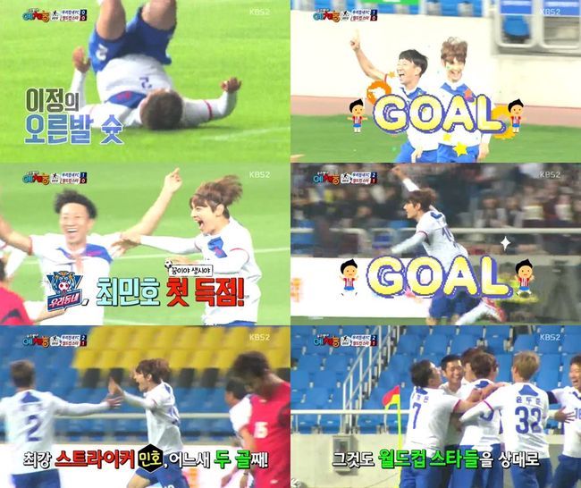 이날 방송에서 민호는 고종수, 이천수, 유상철 등 월드컵 레전드들과의 대결에서 튀어나온 골을 침착하게 골로 연결시키며 선제골을 성공시켰다.