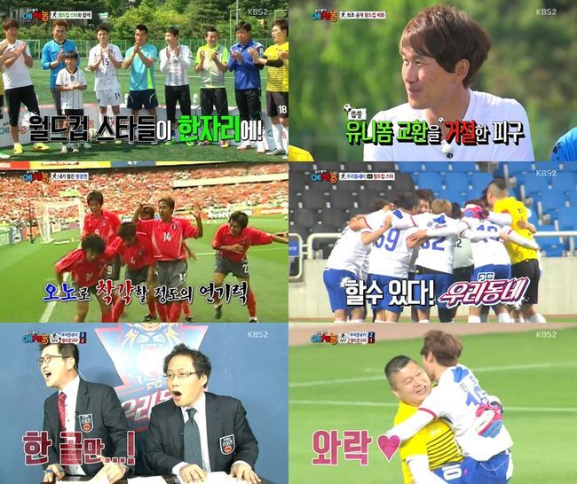지난 3일 오후 방송된 KBS 2TV 예능프로그램 '우리동네 예체능'은 고종수, 이천수, 유상철, 김병지, 최태욱, 백지훈 등 월드컵 스타들을 초대해 월드컵에 대한 추억과 앞으로 열릴 2014 브라질 월드컵에 대한 기대감을 높였다.
