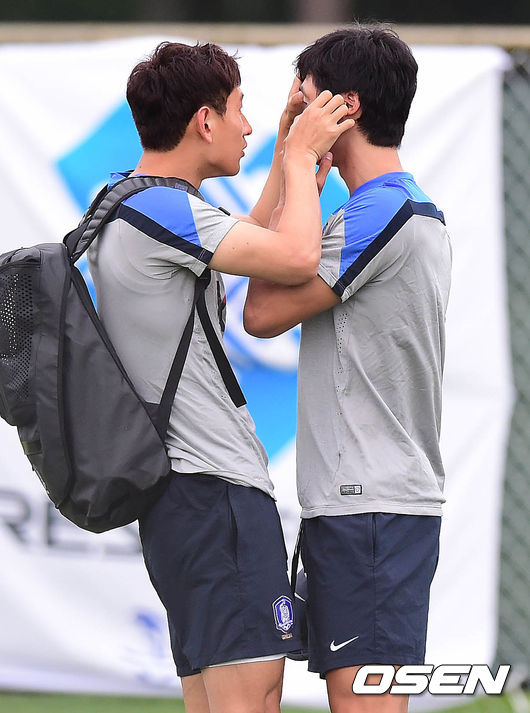 4일 오전(이하 한국시간) 미국 플로리다주 마이애미 세인트 토마스 대학에서 열린 대표팀 전지훈련에서 지동원이 곽태휘의 눈을 봐주고 있다.