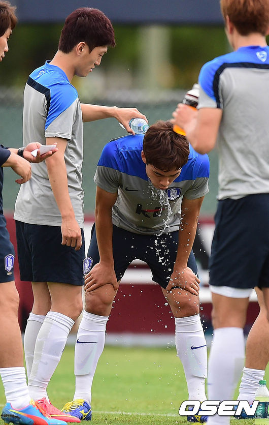 4일 오전(이하 한국시간) 미국 플로리다주 마이애미 세인트 토마스 대학에서 열린 대표팀 전지훈련에서 이청용이 박주영 목에 물을 뿌려주고 있다.
