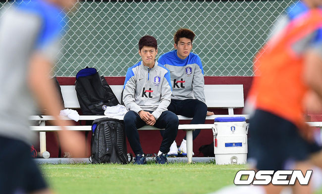 4일 오전(이하 한국시간) 미국 플로리다주 마이애미 세인트 토마스 대학에서 열린 대표팀 전지훈련에서 이청용과 이용이 벤치에 앉아 선수들의 미니게임을 지켜보고 있다.