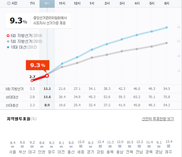 한편 전국 평균 9.3%의 투표율은 지난 4년 전인 2010년 지방선거의 동 시간대 투표율(11.1%) 보다는 다소 낮은 수치다.