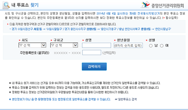 중앙선거관리위원회 홈페이지와 각종 포털사이트를 통해 ‘내 투표소 찾기’를 할 수 있다. 시도 및 구시군을 선택하고 성명과 생년월일, 성별을 입력한 뒤 주민등록번호 끝 3자리까지 입력하면 투표소를 확인할 수 있다.