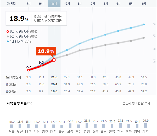 한편 전국 평균 18.9%의 투표율은 지난 4년 전인 2010년 지방선거의 동 시간대 투표율(21.6%) 보다는 다소 낮은 수치다.