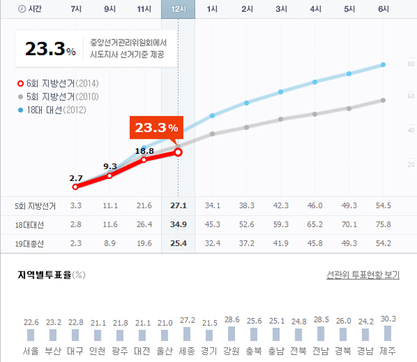 제 6회 전국동시지방선거를 맞아 ‘투표율’이 12시까지 23.3%를 기록하고 있다. 모든 지역이 투표율 20%를 넘어선 가운데, 제주는 30% 투표율도 넘었다.