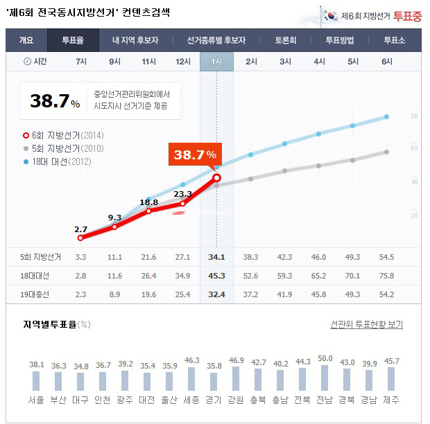 제 6회 전국동시지방선거를 맞아 ‘투표율’이 1시까지 38.7%로 치솟았다. 12시까지 투표율이 23.3%였음을 감안하면 한 시간 만에 무려 15.4%가 증가한 셈이다.
