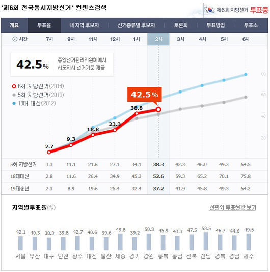 제 6회 전국동시지방선거를 맞아 ‘투표율’이 오후 2시 42.5%를 기록했다. 오후 1시 38.7%였던 투표율은 다소 주춤하는 모양새를 띄고 있다.