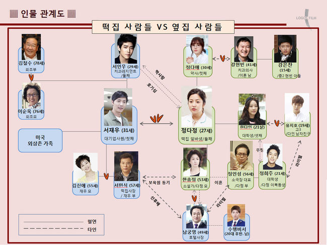 이와 관련 이상우, 박세영을 비롯해 최불암, 나문희, 김미숙, 손창민 등 ‘두 가족 한집 동거’로 얽혀있는 ‘떡집 사람들’과 ‘옆집 사람들’의 세밀한 인연을 도표로 드러내는 ‘인물관계도’가 시선을 모으고 있는 것. ‘황혼 로맨스’를 펼쳐낼 노년의 부부 최불암-나문희는 물론 풋풋한 ‘4차원 커플’ 이상우-박세영, 티격태격 ‘중년 로맨스’ 김미숙-손창민, ‘돌싱 커플’ 정만식-황우슬혜, ‘연상연하 커플’ 고우리-홍빈, ‘비밀스런 부자’ 강남길-곽시양의 관계가 확연히 드러나면서 앞으로 펼쳐질 스토리 전개에 대한 궁금증을 더욱 돋우고 있다.