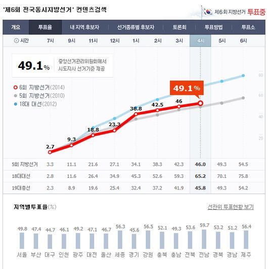 제 6회 전국동시지방선거를 맞아 ‘투표율’이 오후 4시 49.1%를 기록했다. 오후 3시 46%였던 투표율에서 3.1% 상승했다.