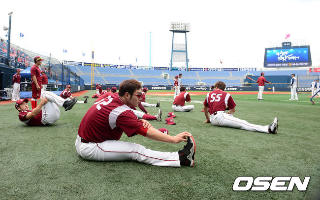경기에 앞서 넥센 선수들이 몸을 풀고 있다.