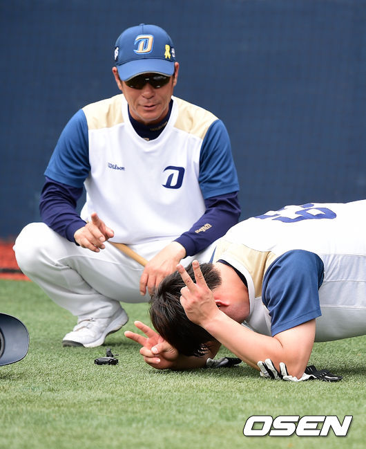 경기에 앞서 NC 권희동이 이광길 코치의 지도 아래 훈련을 하고 있다.