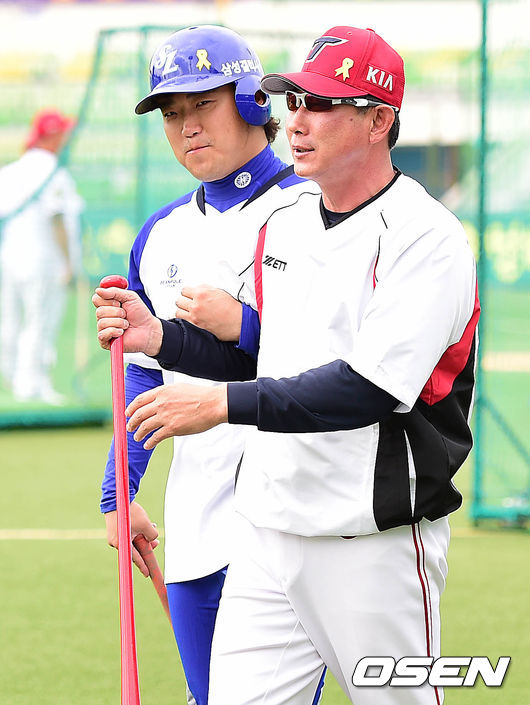 4일 오후 대구구장에서 열리는 '2014 한국야쿠르트 세븐 프로야구' 삼성 라이온즈와 KIA 타이거즈의 경기를 앞두고, KIA 한대화 코치와 삼성 박석민이 인사를 나누고 있다.