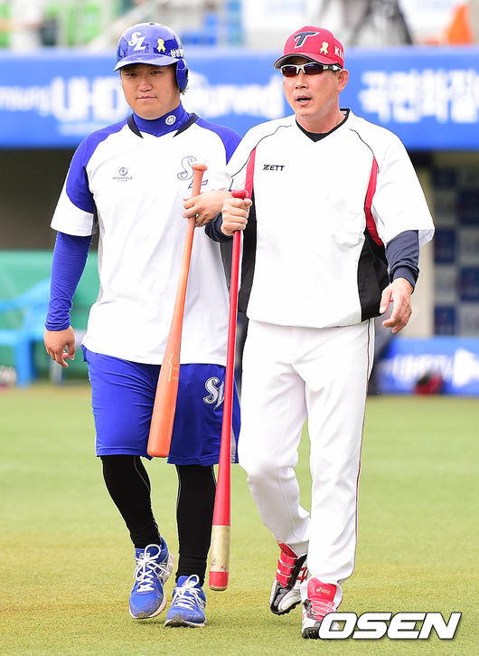 4일 오후 대구구장에서 열리는 '2014 한국야쿠르트 세븐 프로야구' 삼성 라이온즈와 KIA 타이거즈의 경기를 앞두고 KIA 한대화 코치와 삼성 박석민이 인사를 나누고 있다.