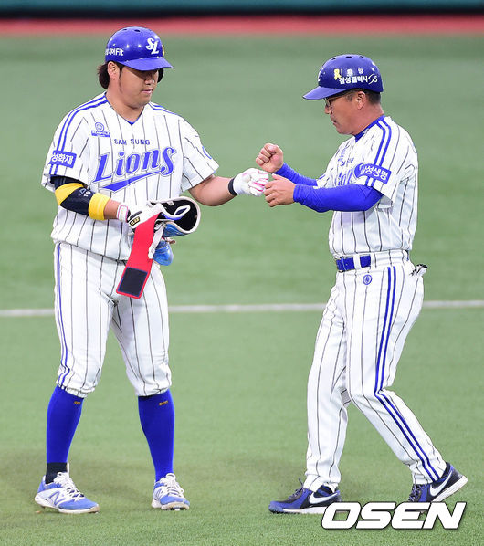 1회말 삼성 공격 2사 2, 3루 상황 박석민이 선제 2타점 좌중간 2루타를 날리고 김평호 코치와 인사를 나누고 있다.