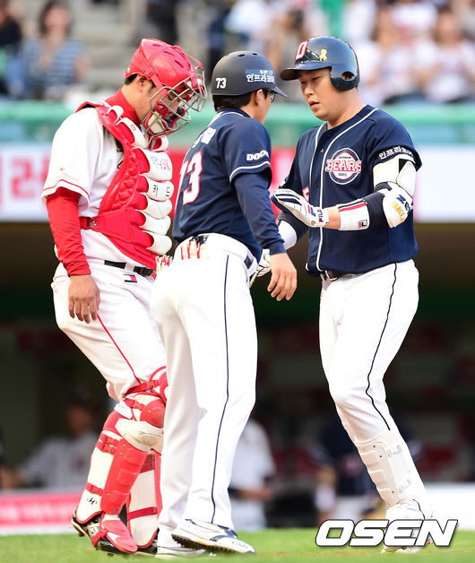 2회초 무사에서 두산 양의지가 좌중월 솔로 홈런을 치고 홈에서 전상렬 코치와 하이파이브를 하고 있다.