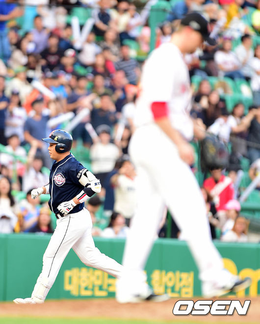 2회초 무사에서 두산 양의지가 좌중월 솔로 홈런을 치고 그라운드를 돌고 있다.