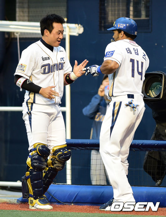 1회말 1사 1,3루에서 NC 테임즈가 역전 스리런을 날리고 김태군과 세레모니를 하고 있다.
