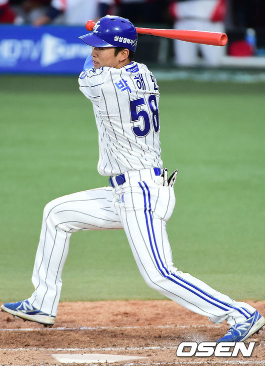 2회말 삼성 공격 선두타자로 나선 박해민이 중전안타를 날리고 있다.