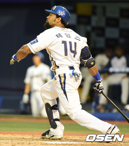 2회말 2사 3루에서 NC 테임즈가 투런포를 날리고 있다.