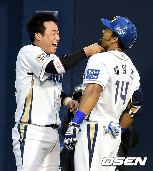 2회말 2사 3루에서 NC 테임즈가 투런포를 날리고 김태군과 세레모니를 하고 있다.