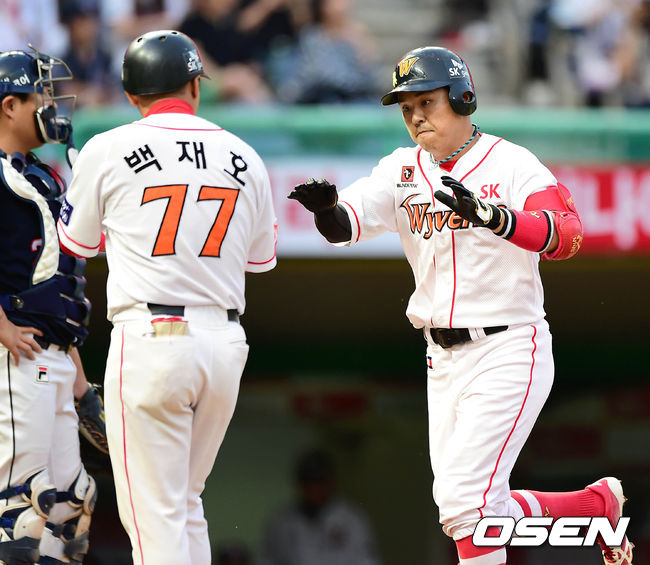 3회말 무사에서 SK 나주환이 좌월 솔로 홈런을 치고 홈에서 백재호 코치와 하이파이브를 하고 있다.
