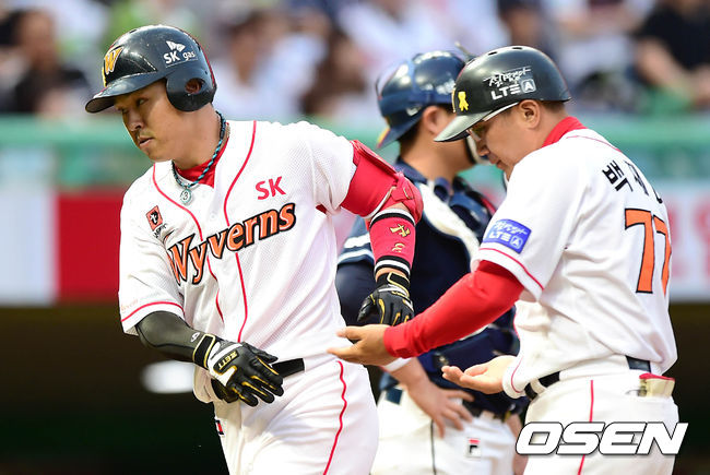 3회말 무사에서 SK 나주환이 좌월 솔로 홈런을 치고 홈에서 백재호 코치와 하이파이브를 하고 있다.