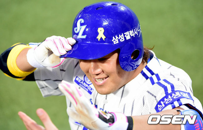3회말 삼성 공격 2사 1, 3루 상황 박석민이 좌월 스리런포를 날리고 홈을 밟은 뒤 더그아웃 동료들과 인사를 나누고 있다.