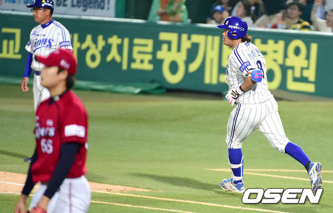 3회말 삼성 공격 2사 1, 3루 상황 박석민이 KIA 선발 한승혁을 상대로 좌월 스리런포를 날리고 그라운드를 돌고 있다.