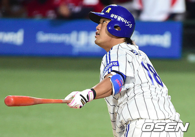 3회말 삼성 공격 2사 1, 3루 상황 박석민이 좌월 스리런포를 날리고 타구를 바라보고 있다.