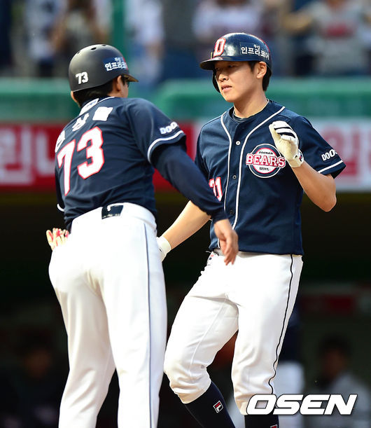 4회초 1사 2루에서 두산 정수빈이 우월 솔로 홈런을 치고 홈에서 전상렬 코치와 하이파이브를 하고 있다.
