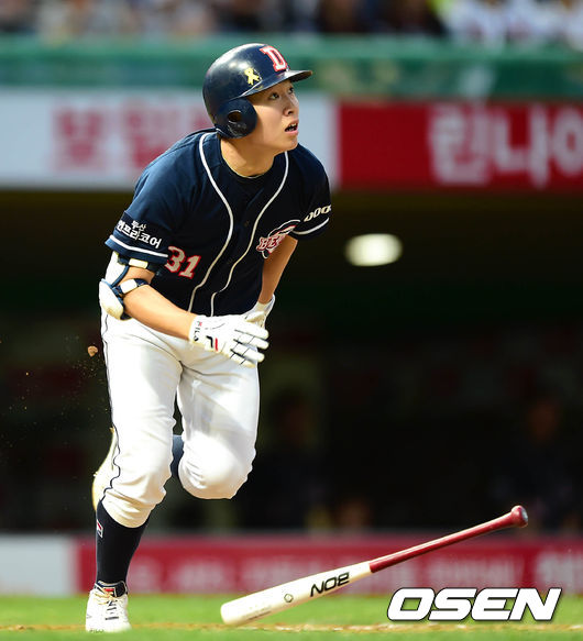 4회초 1사 2루에서 두산 정수빈이 우월 투런 홈런을 치고 있다.