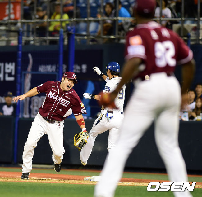 3회 1사 2루에서 NC 김종호가 투수 앞으로 타구를 보내고 1루로 뛰었다. 소사가 공을 잡아 1루로 던진 것이 김종호의 팔꿈치에 맞고 굴절되고 있다.
