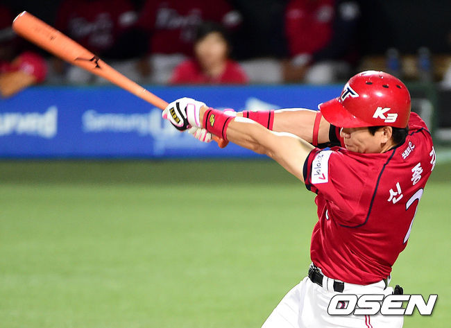 5회초 KIA 공격 선두타자로 나선 신종길이 추격의 좌월 솔로포를 날리고 있다.