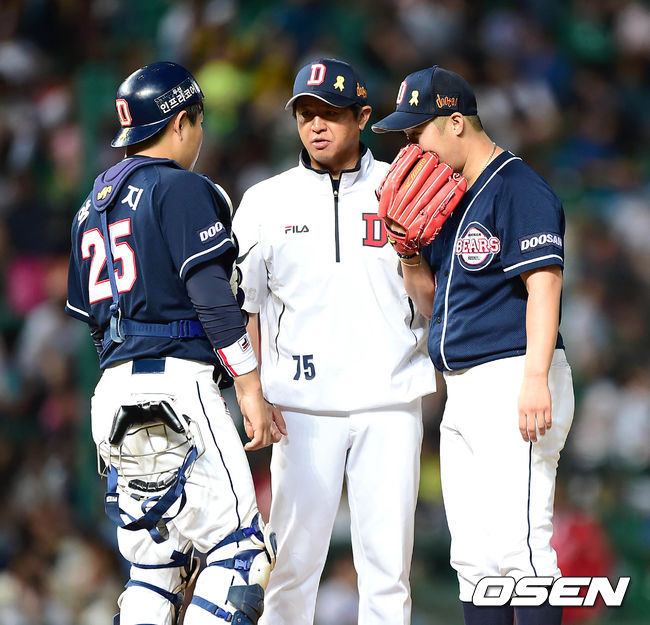 5회말 1사 만루에서 마운드를 방문한 두산 권명철 코치가 유희관과 이야기를 나누고 있다.