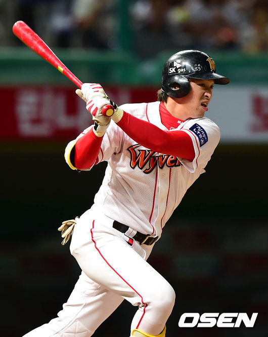 5회말 1사 만루에서 SK 임훈이 우전 적시 2루타를 치고 있다.