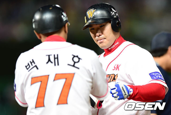5회말 1사 1,3루에서 SK 이재원이 중전 적시타를 치고 백재호 코치와 하이파이브를 하고 있다.