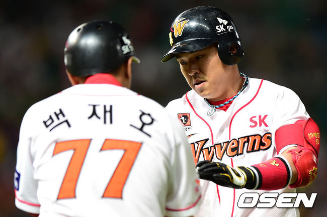 6회말 1사 3루에서 SK 나주환이 희생플라이를 치고 더그아웃으로 가며 백재호 코치와 하이파이브를 하고 있다.