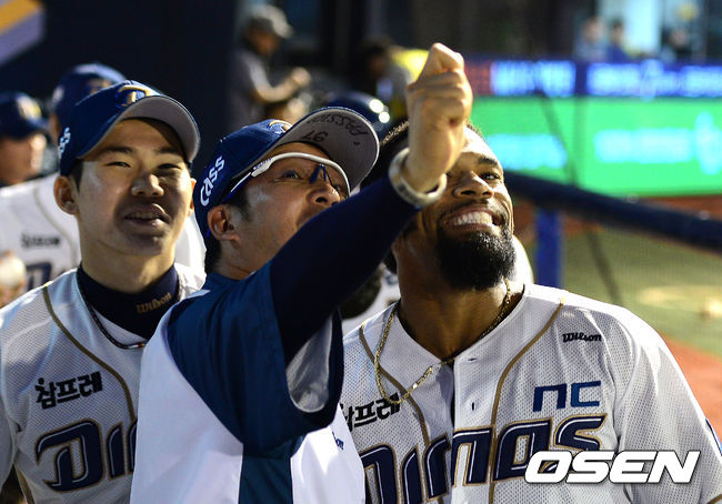 5회말 2사 1루에서 NC 테임즈가 투런포를 날리고 더그아웃에서 최경환 코치와 셀카 세레모니를 하고 있다.