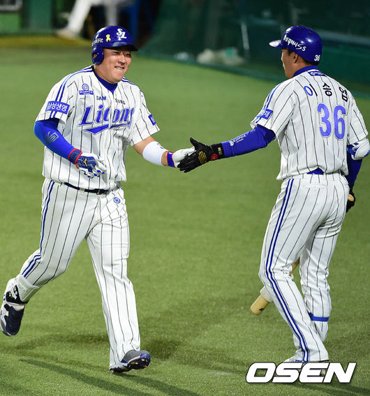 7회말 삼성 공격 1사 1루 상황 최형우가 좌중간 투런포를 날리고 홈을 밟은 뒤 이승엽과 인사를 나누고 있다.