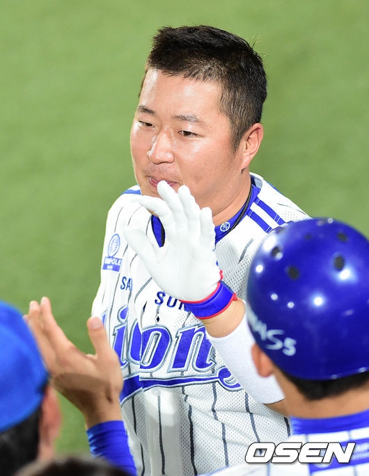 7회말 삼성 공격 1사 1루 상황 최형우가 좌중간 투런포를 날리고 홈을 밟은 뒤 더그아웃 동료들과 인사를 나누고 있다.