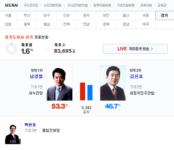 1.6% 개표가 진행된 가운데 남경필 후보는 53.3%의 득표율로 46.7% 득표한 김진표 후보에 다소 앞서고 있다. 출구조사에서는 김진표 후보는 남경필 후보를 2%차로 앞섰다. 그러나 개표 초반에는 출구조사와 다른 결과가 나타나고 있다.