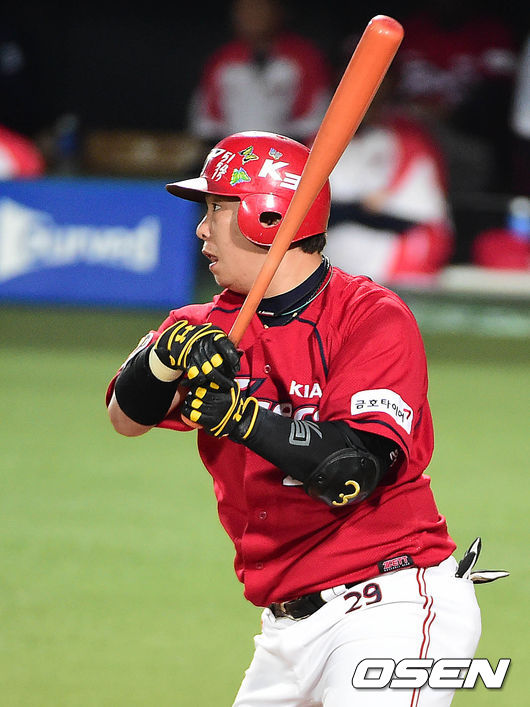 8회초 KIA 공격 2사 2, 3루 상황 나지완이 2타점 중전 적시타를 날리고 있다.