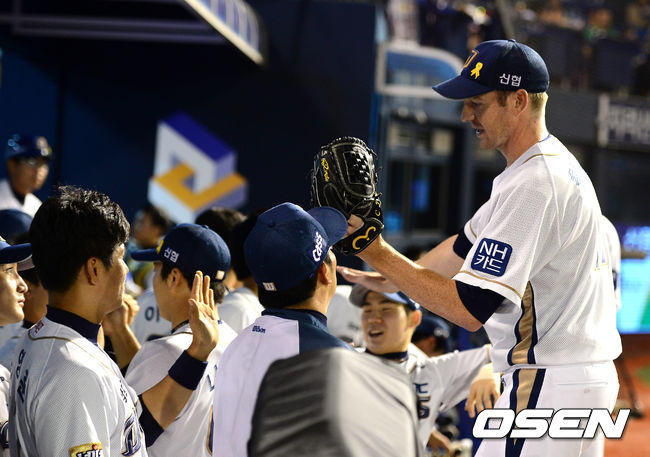 6회초 수비를 마친 찰리가 더그아웃에서 동료선수들과 하이파이브를 하고 있다.